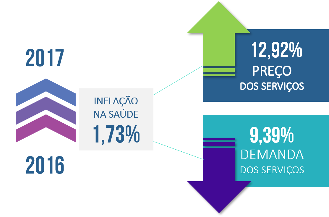 Ressalta-se que o mesmo estudo realizado referente à variação do ano de 2016 para 2017, indicou uma inflação saúde bem menor para o mesmo grupo de Operadoras (1,73%), porém ocorreu um comportamento diferente, com expressivo aumento no preço dos serviços (12,92%), mas com decréscimo na demanda (9,39%), reduzindo o resultado final de variação do custo saúde.